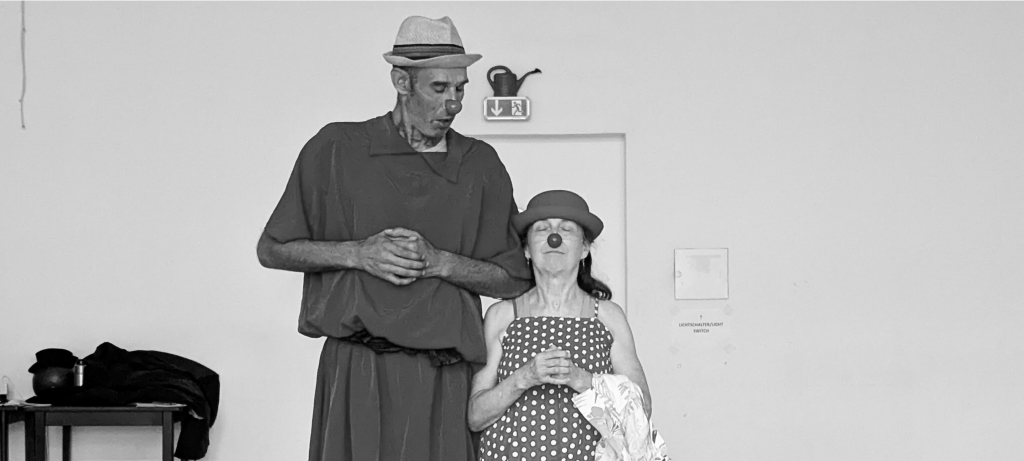 Die künstlerischen Leiterinnen luden die Teilnehmenden zunächst dazu ein, sich auf die Suche nach dem eigenen Clown zu machen und an dieser Figur weiterzuarbeiten, durch Körper, Stimme und Requisiten.