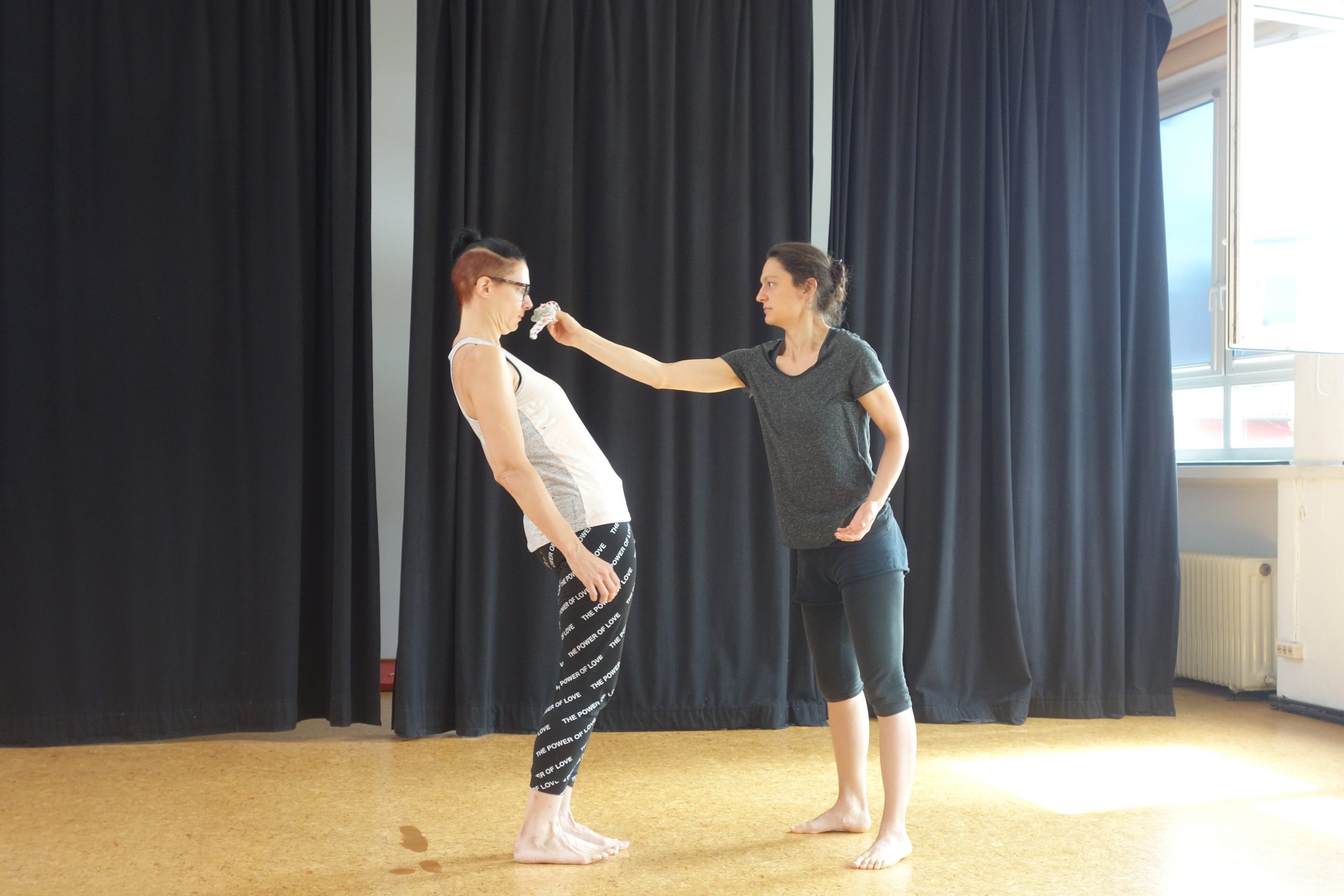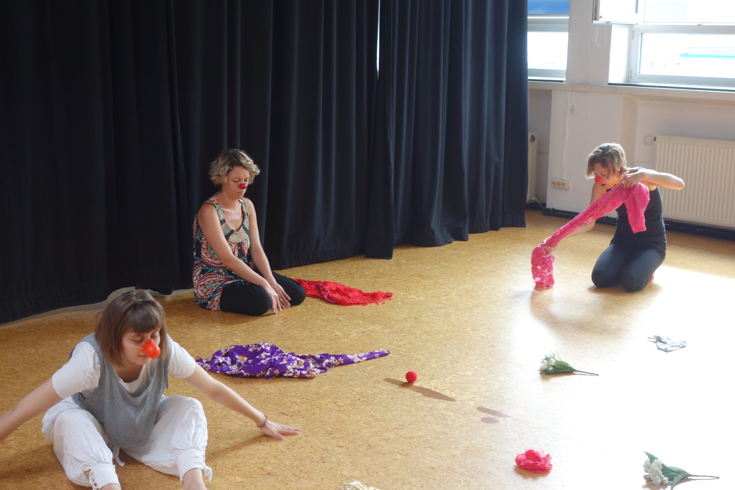 Lucie Betz und Maja von Kriegstein hatten es sich so zum Ziel gesetzt, gemeinsam mit den Teilnehmenden in eine Recherche zu Körper und Klang einzutauchen. Ein weiteres Ziel war dabei zudem die Stärkung der Präsenz auf der Bühne. Arbeitsmittel waren unter anderem Improvisation und Training mit Rhythmen, dem Geben und Nehmen eines Fokuses, sich zeigen, sich zu verstecken und vieles mehr… Genutzt wurden dafür Kostüme, traditionelle und experimentelle Instrumente, sowie Alltagsgegenstände.