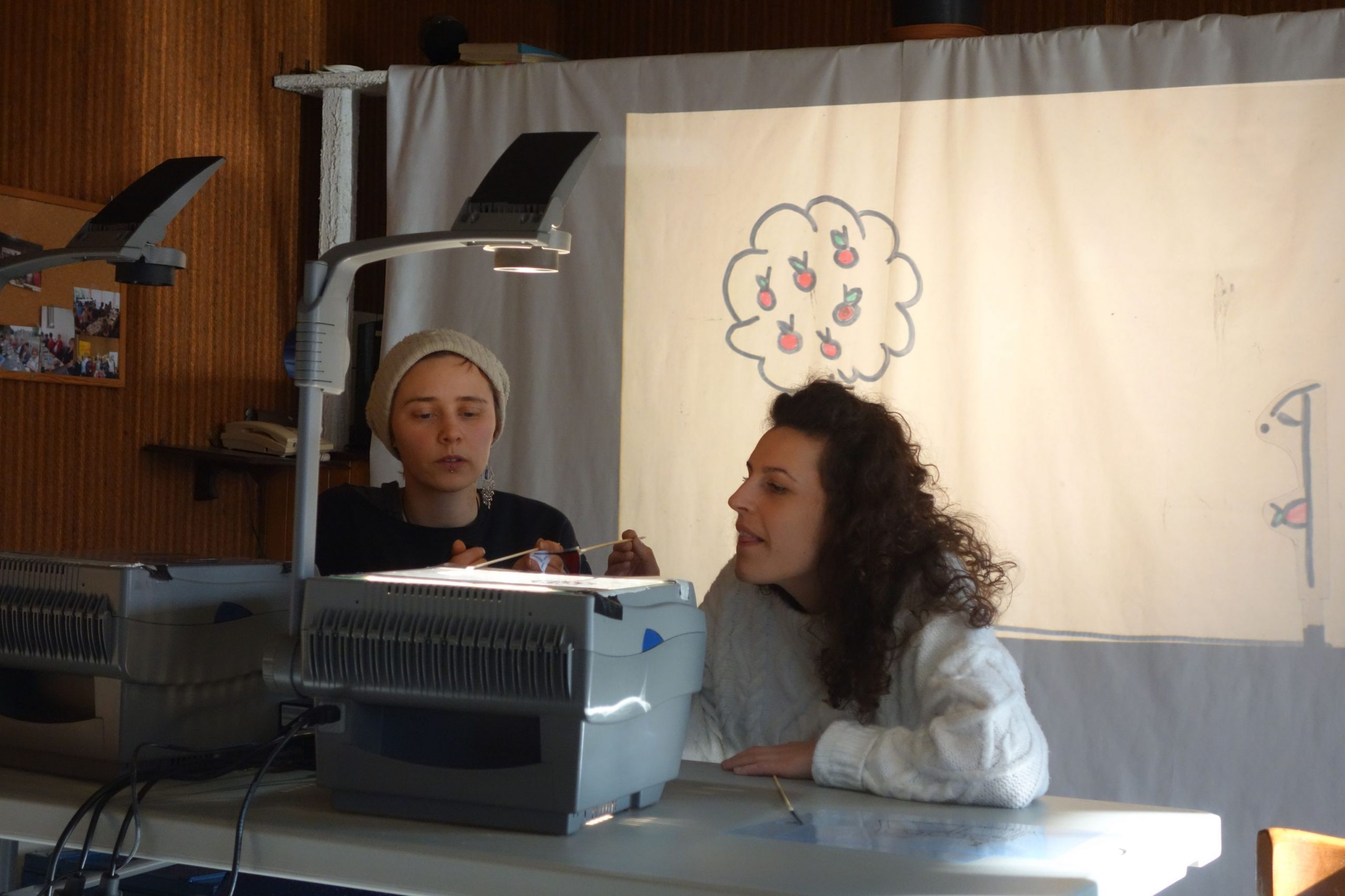 Die Teilnehmer:innen haben mit Zeichnungen, Collagen, Fotos usw. mittels eines Overheadprojektors eine imaginäre Welt erschaffen und gleichzeitig an Methoden gearbeitet, diese Elemente zu animieren.
