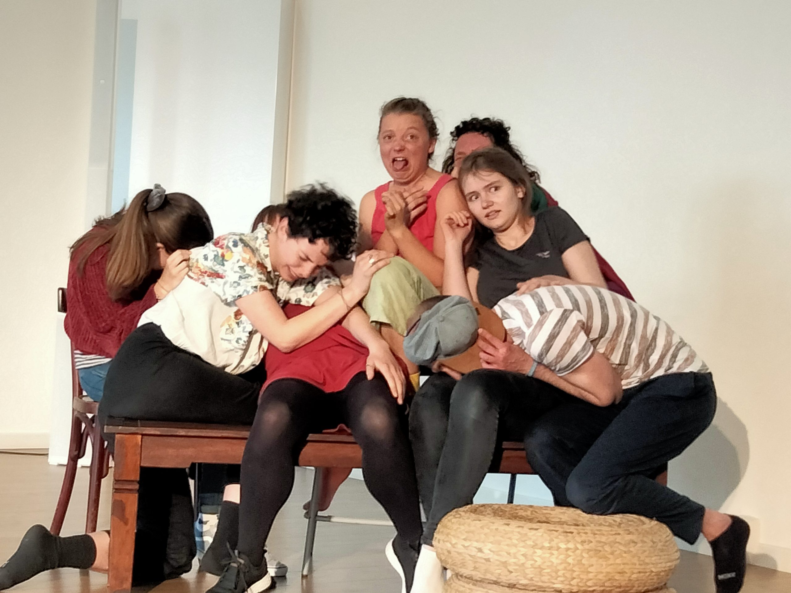 Les intervenant.es ont guidé les participant.es à travers l’exploration de la présence scénique et la connexion à soi-même pour chercher à atteindre une authenticité dans l’expression théâtrale. Puisant dans leurs propres expériences artistiques, les intervenant.es ont nourri le travail d’improvisation à travers divers exercices et méthodes (technique Meisner, action et réaction, théâtre d’objet, etc.). Au-delà des différences,le groupe a tenté de trouver un langage commun pour improviser et expérimenter ensemble.