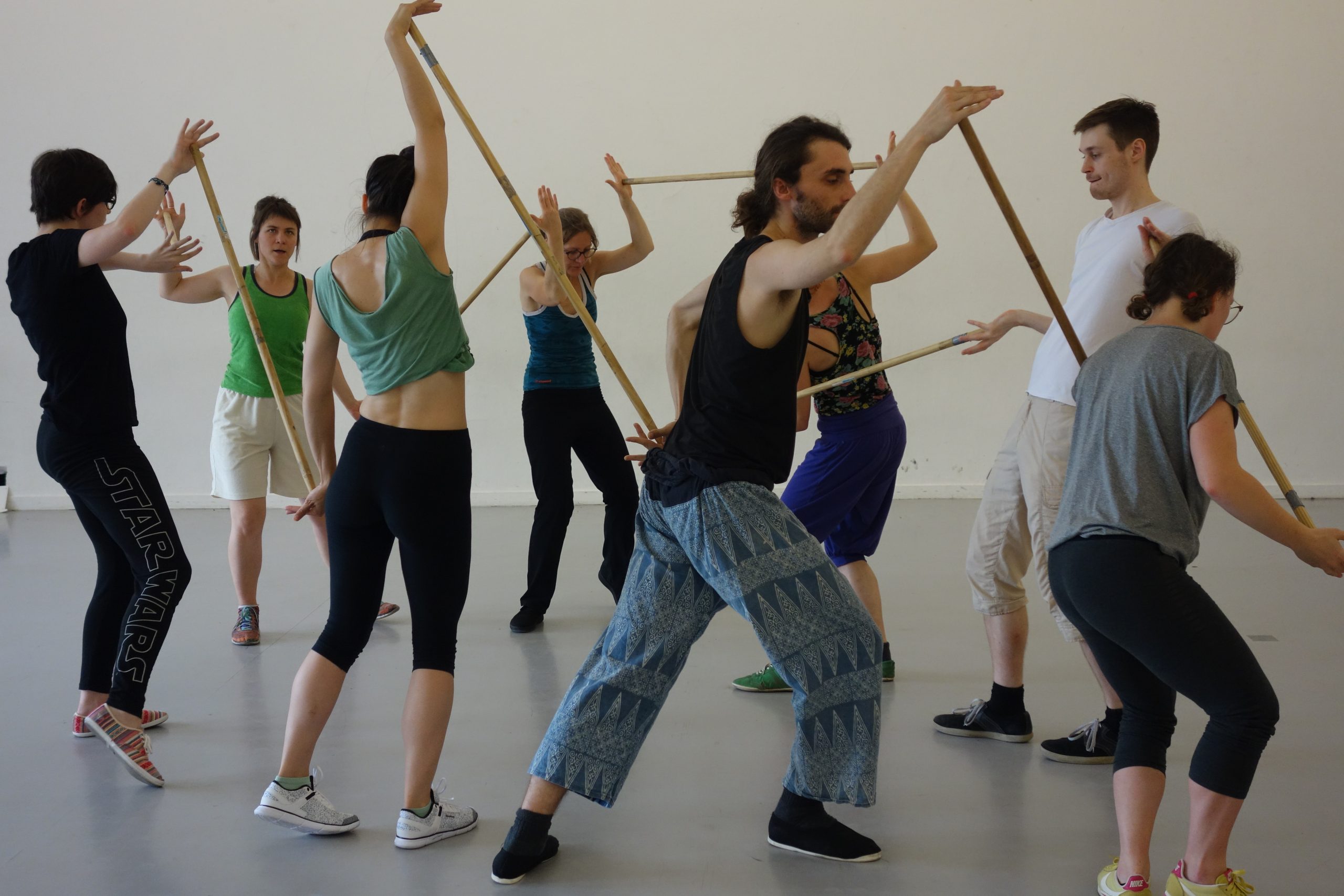 Ce stage s’adressait à des jeunes comédiens venant de France et d’Allemagne, curieux d’approfondir leur connaissance du théâtre gestuel. Ils ont eu l’occasion de rencontrer et d’apprendre de spécialistes de différentes écoles européennes de théâtre du mouvement, et ainsi de confronter les conceptions du mime selon Marceau, le mime corporel développé par Decroux, la biomécanique de Meyerhold et d’autres techniques contemporaines…